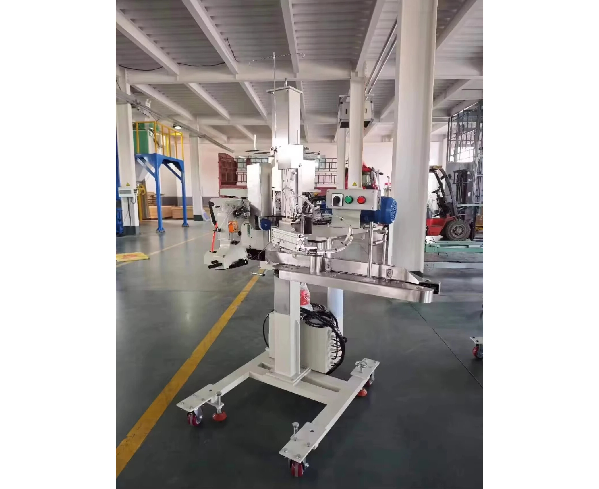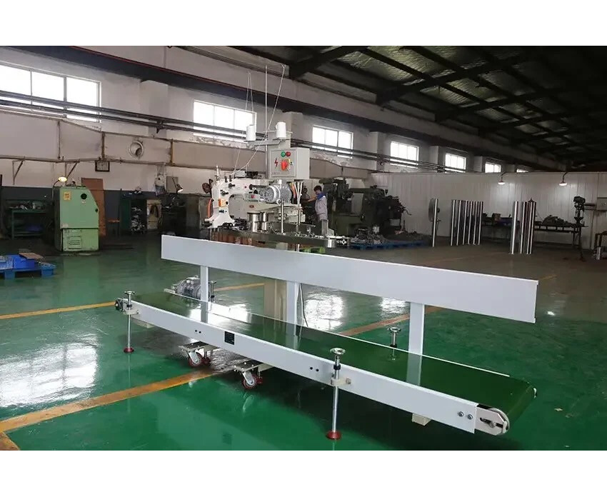Αυτόματο σύστημα ραφής κλεισίματος σακιών με δυο κλωστές και ενσωματωμένο ταινιόδρομο 2,5m, εξοπλισμένη με οδηγό γυρίσματος σακιού πριν την ραφή για πιο ασφαλές κλείσιμο, με αισθητήρα αναγνώρισης τροφοδοσίας σακιού και αυτόματο κόψιμο κλωστής. Κατάλληλη για τρόφιμα, λιπάσματα, σπόρους, χημικά, κ.α.